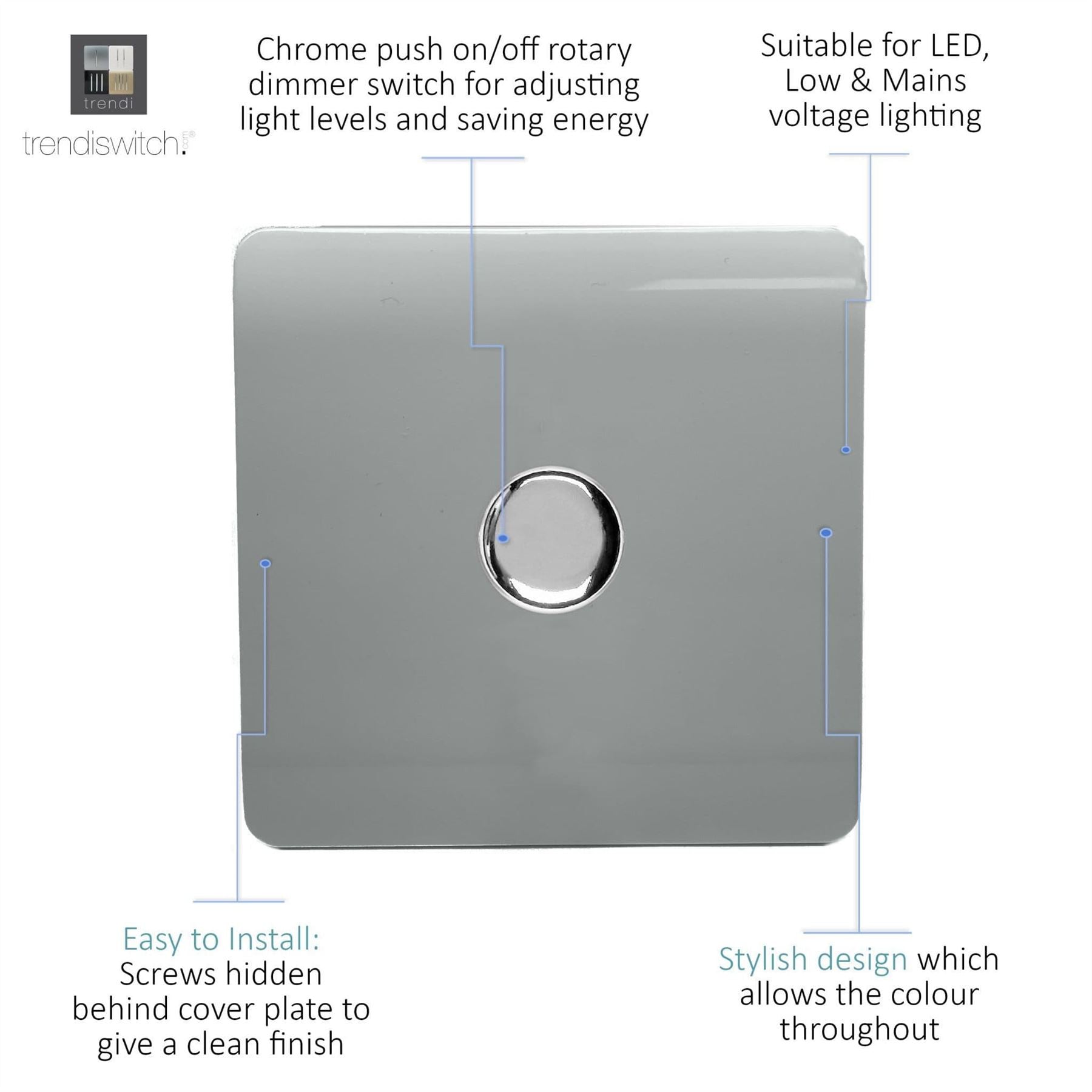 Upgrade your lighting with the Trendi Switch 1 Gang 2-Way 100w LED Dimmer Light Switch, a sleek and stylish solution for modern interiors. Designed for dimmable LED bulbs, this rotary push on/off dimmer offers smooth, reliable control with a maximum load of 5-100w LEDs. Crafted with a screwless faceplate and a premium chrome dimmer knob, the Trendi LED dimmer switch is as functional as it is elegant - making it the perfect choice for contemporary homes. Key Features: Product Colour: Platinum Silver 1-Gang 2-Way Push On/Off Rotary LED Dimmer (5-100w LED load capacity) Ideal for LED lighting - tested for 0-10 dimmable LED bulbs Chrome knob finish for a premium designer look Screwless faceplate with included back and front plates Ultra-slim profile: 89 x 89 x 48mm (Faceplate depth: 8mm) Lightweight and durable: 100g Easy installation - fits a 25mm back box Operating voltage: 220-250V AC 5-Year Warranty - British made, certified & tested to BS EN 60669-2-1 Safe for indoor, domestic lighting circuits Safety Information: For indoor use only Use only with dimmable LED light bulbs (not suitable for non-dimmable fluorescents, wire-wound or toroidal transformers, TRIAC dimmable loads, or electric motors) Do not overload the switch The Trendi Switch LED Dimmer combines modern design with advanced functionality, giving you a reliable and stylish lighting solution. Whether you're upgrading a single room or renovating your entire home, this designer chrome dimmer switch adds a touch of elegance to any space - #definedbydesign.