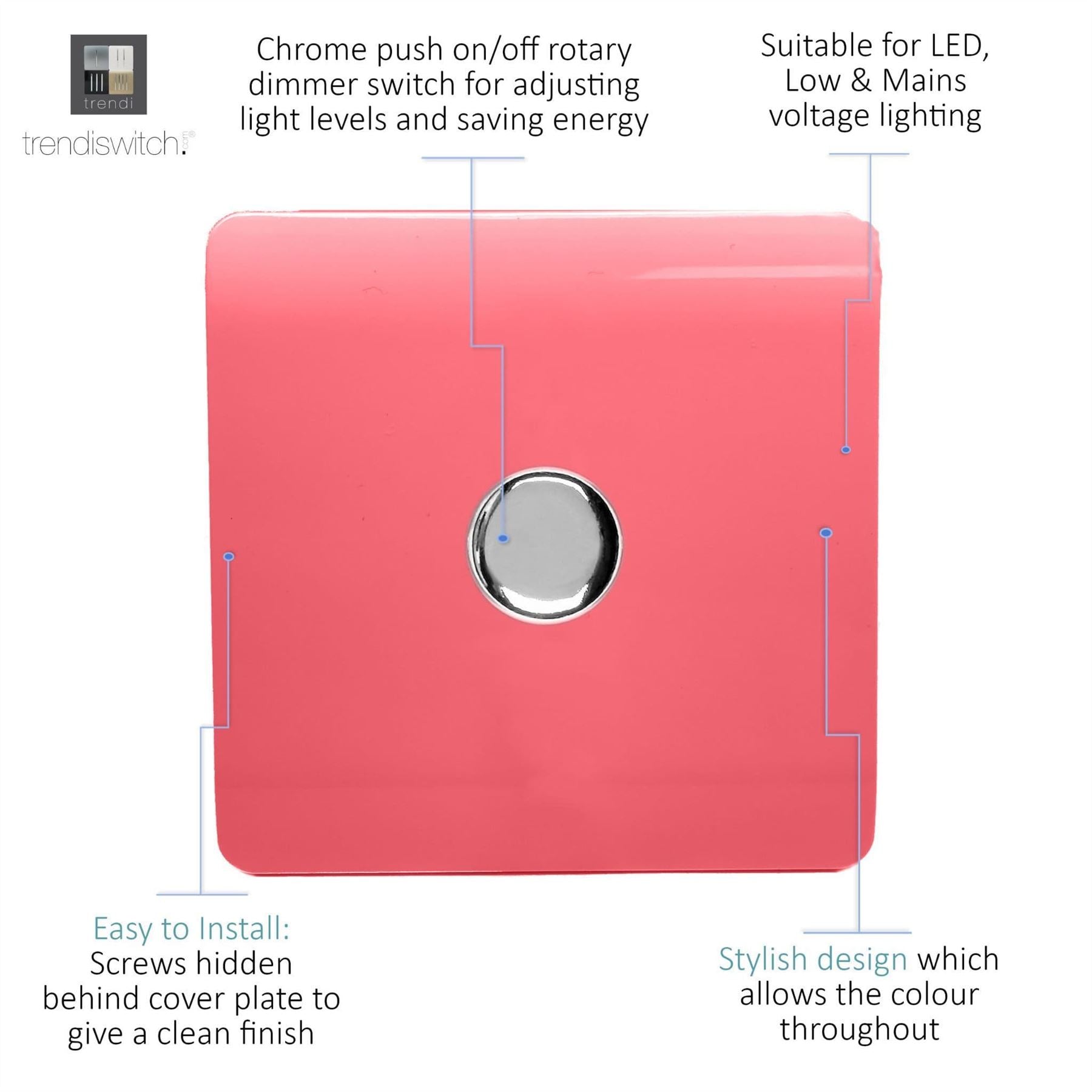 Upgrade your lighting with the Trendi Switch 1 Gang 2-Way 100w LED Dimmer Light Switch, a sleek and stylish solution for modern interiors. Designed for dimmable LED bulbs, this rotary push on/off dimmer offers smooth, reliable control with a maximum load of 5-100w LEDs. Crafted with a screwless faceplate and a premium chrome dimmer knob, the Trendi LED dimmer switch is as functional as it is elegant - making it the perfect choice for contemporary homes. Key Features: Product Colour: Strawberry 1-Gang 2-Way Push On/Off Rotary LED Dimmer (5-100w LED load capacity) Ideal for LED lighting - tested for 0-10 dimmable LED bulbs Chrome knob finish for a premium designer look Screwless faceplate with included back and front plates Ultra-slim profile: 89 x 89 x 48mm (Faceplate depth: 8mm) Lightweight and durable: 100g Easy installation - fits a 25mm back box Operating voltage: 220-250V AC 5-Year Warranty - British made, certified & tested to BS EN 60669-2-1 Safe for indoor, domestic lighting circuits Safety Information: For indoor use only Use only with dimmable LED light bulbs (not suitable for non-dimmable fluorescents, wire-wound or toroidal transformers, TRIAC dimmable loads, or electric motors) Do not overload the switch The Trendi Switch LED Dimmer combines modern design with advanced functionality, giving you a reliable and stylish lighting solution. Whether you're upgrading a single room or renovating your entire home, this designer chrome dimmer switch adds a touch of elegance to any space - #definedbydesign.