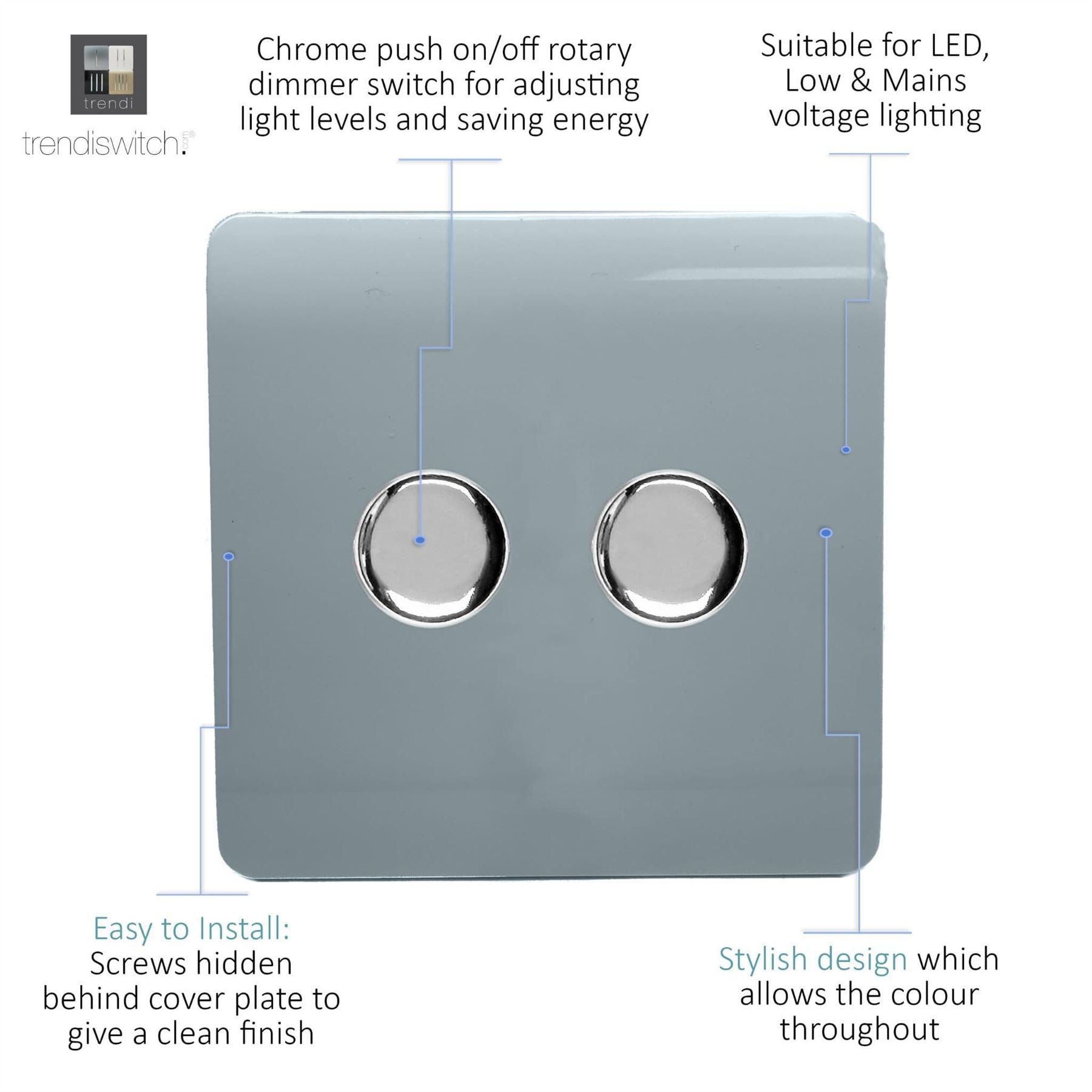 Upgrade your lighting with the Trendi Switch 2 Gang 2-Way 100w LED Dimmer Light Switch, a sleek and stylish solution for modern interiors. Designed for dimmable LED bulbs, this rotary push on/off dimmer offers smooth, reliable control with a maximum load of 5-100w LEDs. Crafted with a screwless faceplate and a premium chrome dimmer knob, the Trendi LED dimmer switch is as functional as it is elegant making it the perfect choice for contemporary homes. Key Features: Product Colour: Cool Grey 2-Gang 2-Way Push On/Off Rotary LED Dimmer (5-100w LED load capacity) Ideal for LED lighting tested for 0-10 dimmable LED bulbs Chrome knob finish for a premium designer look Screwless faceplate with included back and front plates Ultra-slim profile: 89 x 89 x 48mm (Faceplate depth: 8mm) Lightweight and durable: 160g Easy installation fits a 25mm back box Operating voltage: 220-250V AC 5-Year Warranty British made, certified & tested to BS EN 60669-2-1 Safe for indoor, domestic lighting circuits Safety Information: For indoor use only Use only with dimmable LED light bulbs (not suitable for non-dimmable fluorescents, wire-wound or toroidal transformers, TRIAC dimmable loads, or electric motors) Do not overload the switch The Trendi Switch LED Dimmer combines modern design with advanced functionality, giving you a reliable and stylish lighting solution. Whether you're upgrading a single room or renovating your entire home, this designer chrome dimmer switch adds a touch of elegance to any space #definedbydesign.