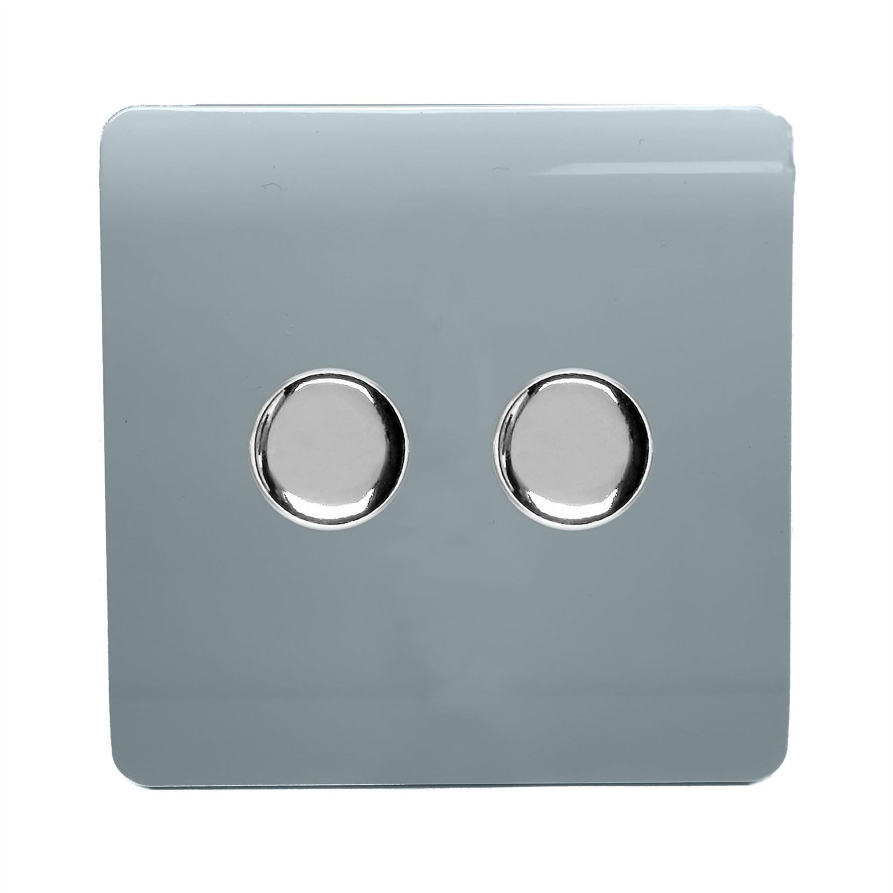 Trendi 2 Gang 2 Way 240V 100w LED Dimmer Screwless Raised Front Plate Plastic Artistic Modern Glossy 10 Amp Chrome Single Electrical Wall Light Switch in Cool Grey - ART-2LDMCG