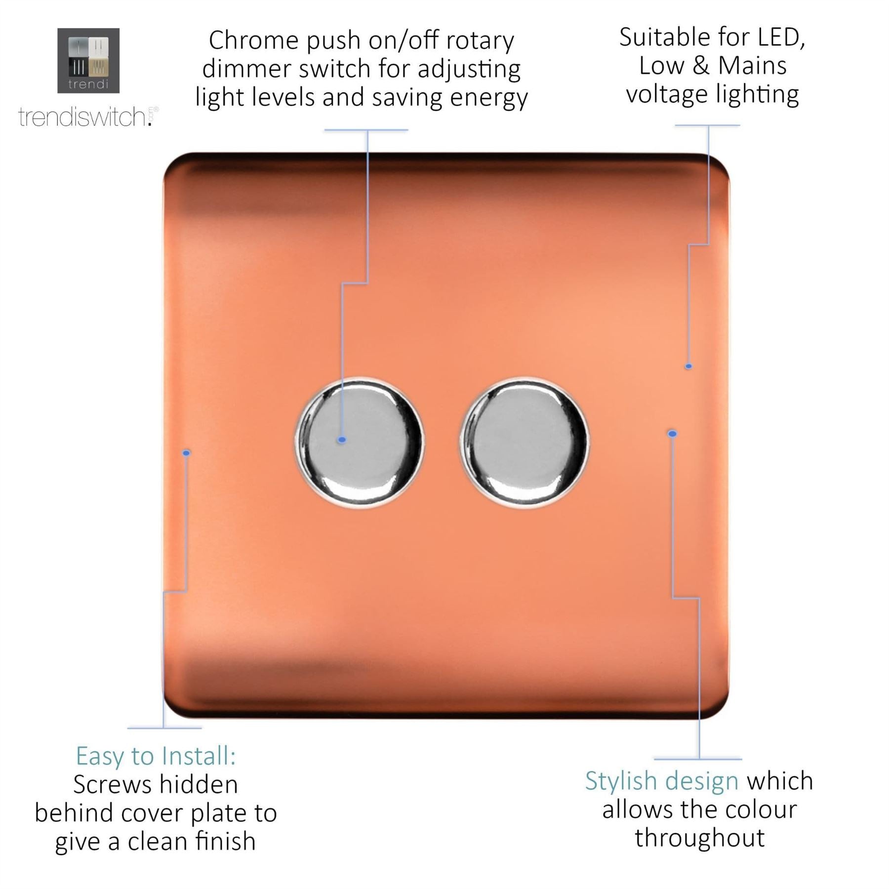 Upgrade your lighting with the Trendi Switch 2 Gang 2-Way 100w LED Dimmer Light Switch, a sleek and stylish solution for modern interiors. Designed for dimmable LED bulbs, this rotary push on/off dimmer offers smooth, reliable control with a maximum load of 5-100w LEDs. Crafted with a screwless faceplate and a premium chrome dimmer knob, the Trendi LED dimmer switch is as functional as it is elegant making it the perfect choice for contemporary homes. Key Features: Product Colour: Copper 2-Gang 2-Way Push On/Off Rotary LED Dimmer (5-100w LED load capacity) Ideal for LED lighting tested for 0-10 dimmable LED bulbs Chrome knob finish for a premium designer look Screwless faceplate with included back and front plates Ultra-slim profile: 89 x 89 x 48mm (Faceplate depth: 8mm) Lightweight and durable: 160g Easy installation fits a 25mm back box Operating voltage: 220-250V AC 5-Year Warranty British made, certified & tested to BS EN 60669-2-1 Safe for indoor, domestic lighting circuits Safety Information: For indoor use only Use only with dimmable LED light bulbs (not suitable for non-dimmable fluorescents, wire-wound or toroidal transformers, TRIAC dimmable loads, or electric motors) Do not overload the switch The Trendi Switch LED Dimmer combines modern design with advanced functionality, giving you a reliable and stylish lighting solution. Whether you're upgrading a single room or renovating your entire home, this designer chrome dimmer switch adds a touch of elegance to any space #definedbydesign.