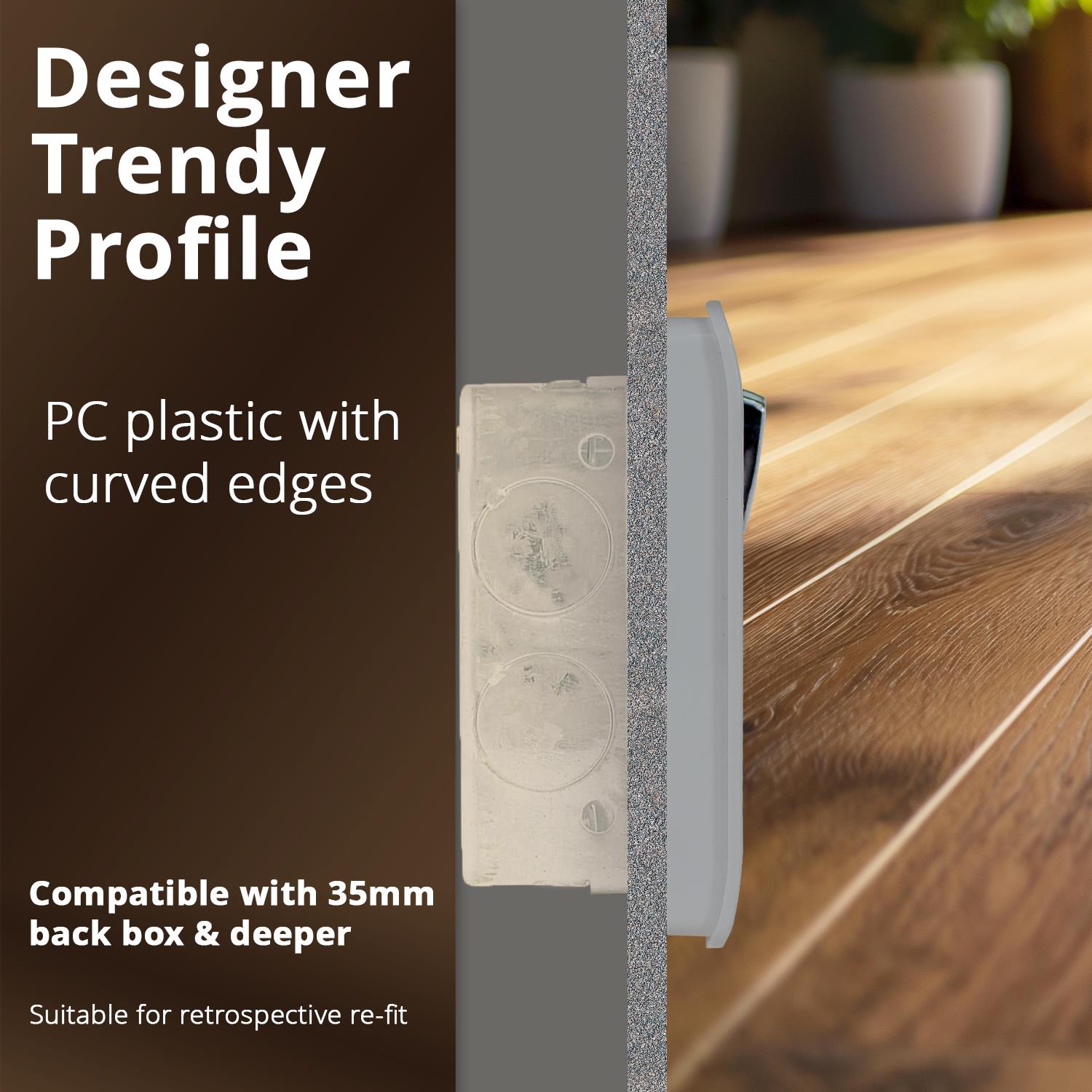 Trendi Modern Gloss 2 Gang 13 Amp Designer Socket � Gloss Platinum Silver Finish Enhance your home with the Trendi Modern Gloss 2 Gang 13 Amp Designer Socket, part of our exclusive range of high-quality switches and sockets. Designed for modern interiors, this sleek and stylish socket features a Gloss silver finish with a large decorative chrome accent that not only adds a touch of sophistication but also ensures it�s easy to locate and use. Whether you're updating your home or undergoing a full renovation, this socket is the perfect addition for any contemporary space. The Trendi Modern Gloss Socket is not just about looks; it�s built for practicality. The large chrome rocker is tactile and smooth, providing a satisfying and reliable action each time you use it. Plus, its glossy surface is easy to clean, helping to maintain a pristine, stylish look in your home for years to come. Key Features: Sleek and Stylish: Gloss silver finish with a large, tactile chrome rocker switch, adding a touch of modern elegance to any room. Easy to Install: No additional wiring required�simply replace your old socket with this easy-to-install model. Durable Construction: Made from fireproof ABS plastic for added safety, and a high-quality plastic faceplate that won�t fade over time. Low Maintenance: Easy to clean and maintain, ensuring it always looks as good as new. Technical Specifications: Type: 2 Gang 13 Amp Socket Certification: CE Certified for safety and reliability Dimensions: 172mm (W) x 86mm (H) x 35mm (D) Installation: Requires a minimum depth of 35mm back box Warranty: 5-Year guarantee for peace of mind Upgrade your home with the Trendi Modern Gloss 2 Gang 13 Amp Designer Socket � a perfect blend of modern design, functionality, and durability. Whether you're updating your living room, bedroom, or office, this socket will provide a high-end, reliable solution for all your electrical needs.