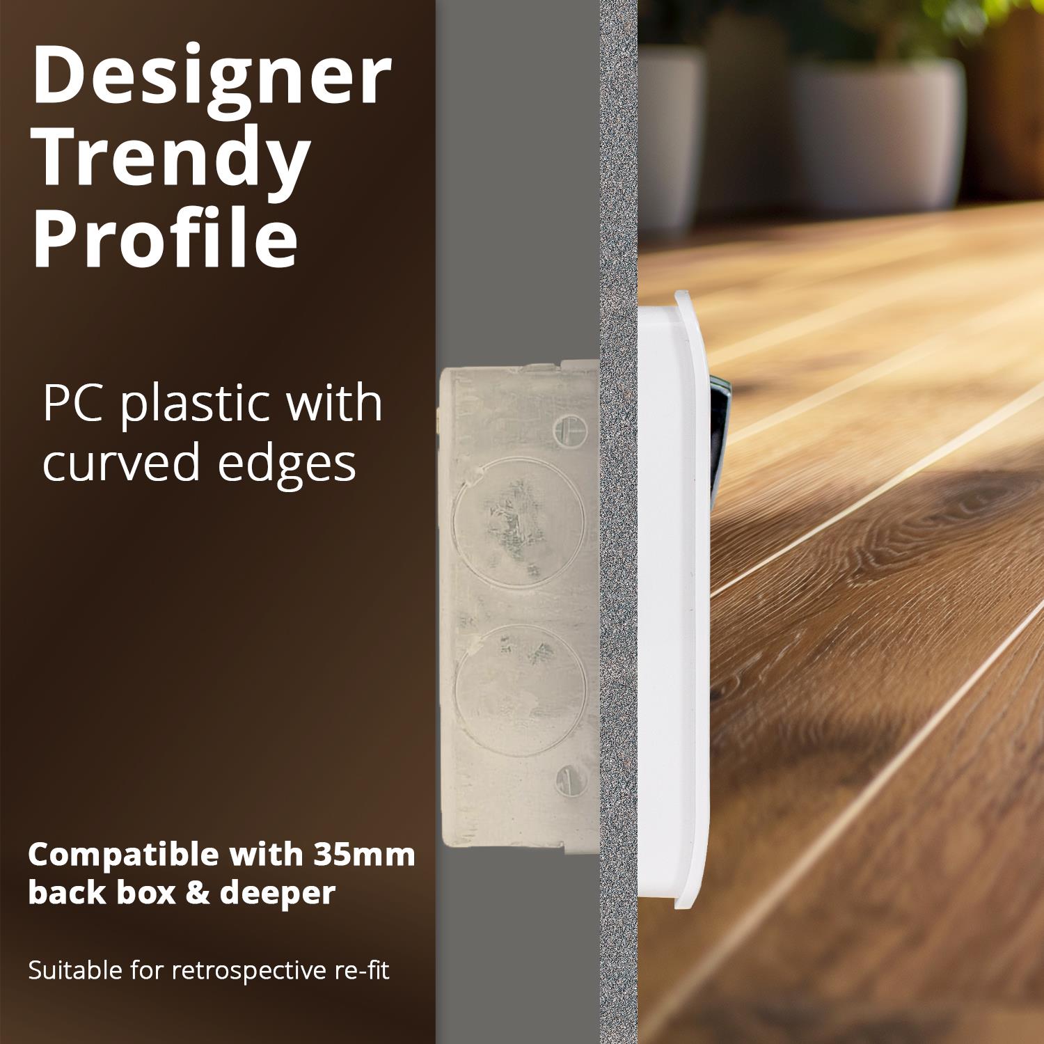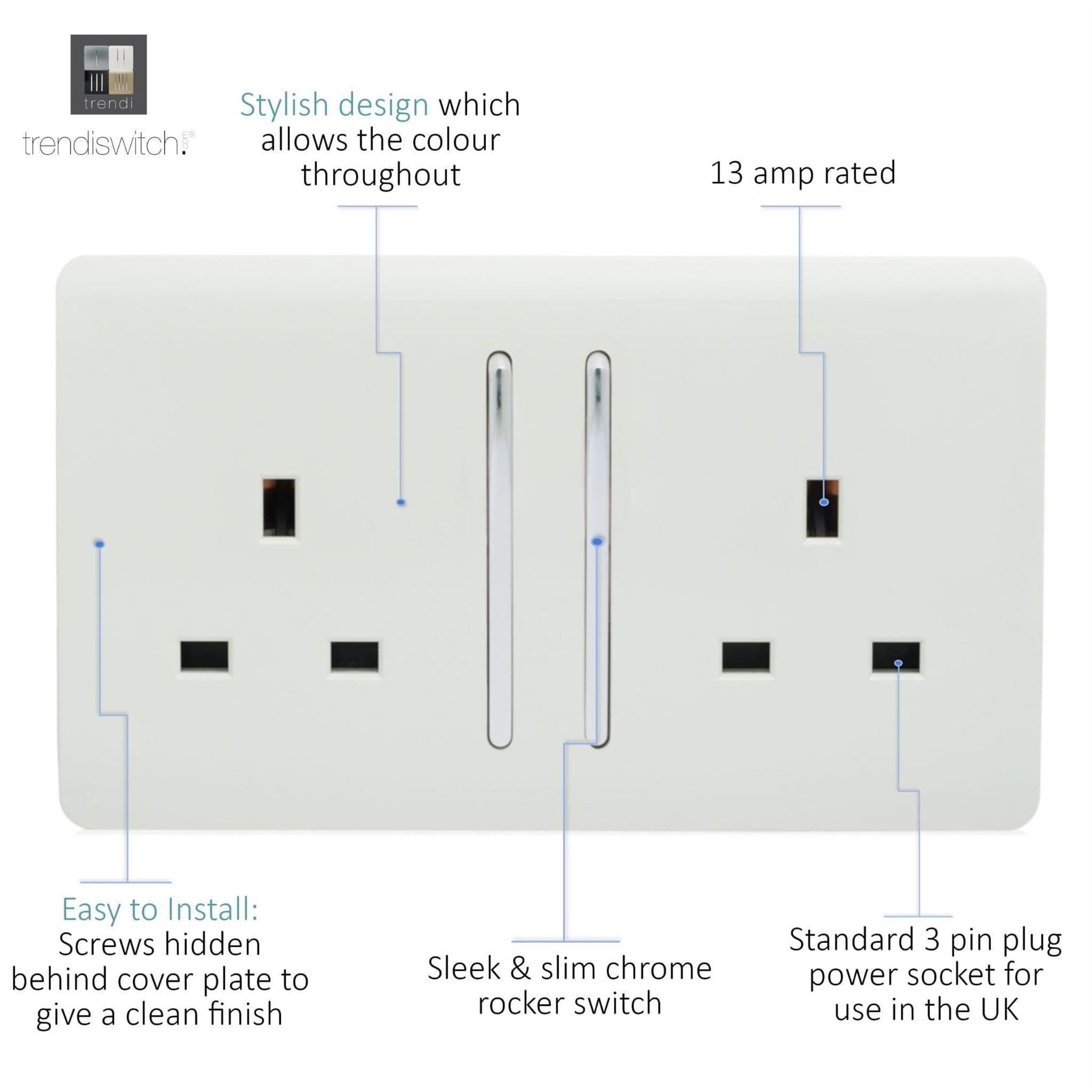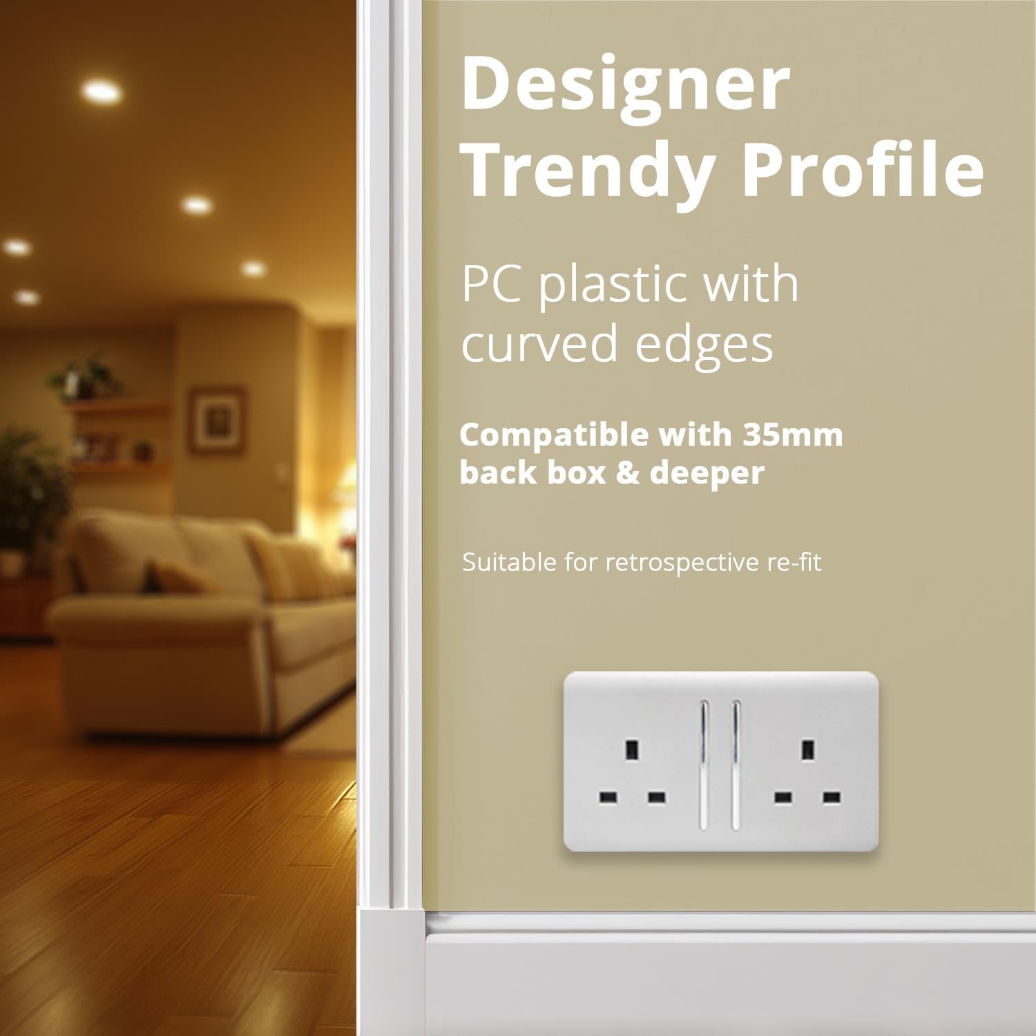Trendi Modern Gloss 2 Gang 13 Amp Designer Socket � Gloss Ice White Finish Enhance your home with the Trendi Modern Gloss 2 Gang 13 Amp Designer Socket, part of our exclusive range of high-quality switches and sockets. Designed for modern interiors, this sleek and stylish socket features a Gloss white finish with a large decorative chrome accent that not only adds a touch of sophistication but also ensures it�s easy to locate and use. Whether you're updating your home or undergoing a full renovation, this socket is the perfect addition for any contemporary space. The Trendi Modern Gloss Socket is not just about looks; it�s built for practicality. The large chrome rocker is tactile and smooth, providing a satisfying and reliable action each time you use it. Plus, its glossy surface is easy to clean, helping to maintain a pristine, stylish look in your home for years to come. Key Features: Sleek and Stylish: Gloss white finish with a large, tactile chrome rocker switch, adding a touch of modern elegance to any room. Easy to Install: No additional wiring required�simply replace your old socket with this easy-to-install model. Durable Construction: Made from fireproof ABS plastic for added safety, and a high-quality plastic faceplate that won�t fade over time. Low Maintenance: Easy to clean and maintain, ensuring it always looks as good as new. Technical Specifications: Type: 2 Gang 13 Amp Socket Certification: CE Certified for safety and reliability Dimensions: 172mm (W) x 86mm (H) x 35mm (D) Installation: Requires a minimum depth of 35mm back box Warranty: 5-Year guarantee for peace of mind Upgrade your home with the Trendi Modern Gloss 2 Gang 13 Amp Designer Socket � a perfect blend of modern design, functionality, and durability. Whether you're updating your living room, bedroom, or office, this socket will provide a high-end, reliable solution for all your electrical needs.