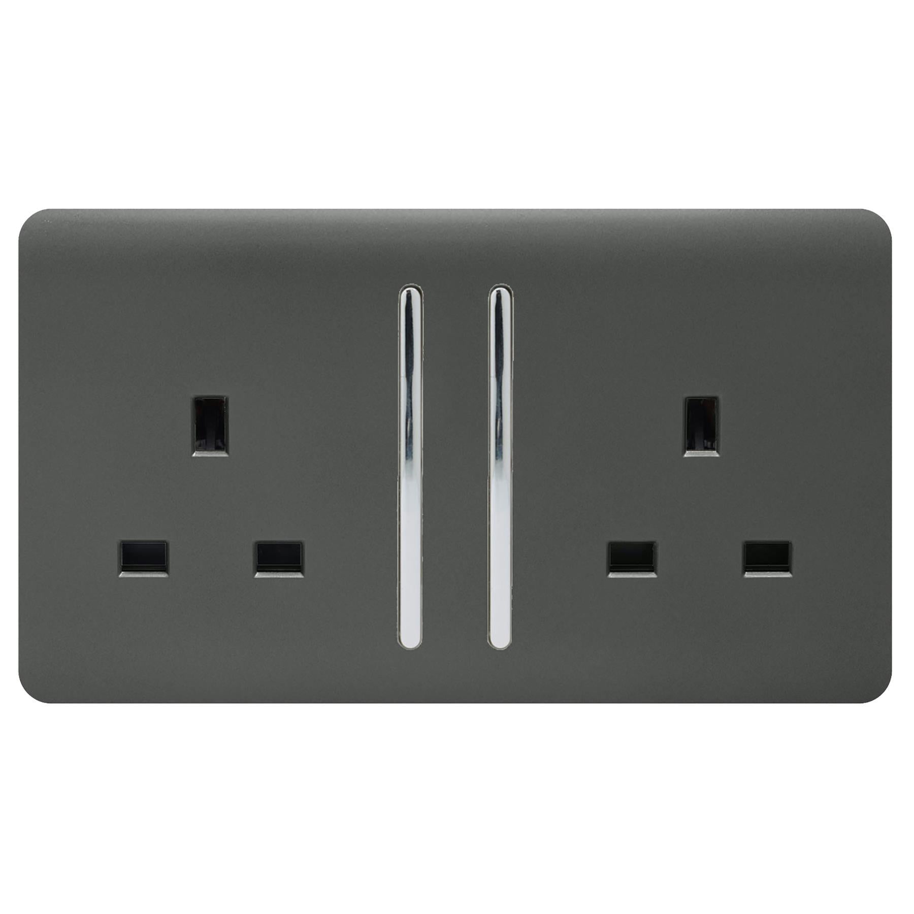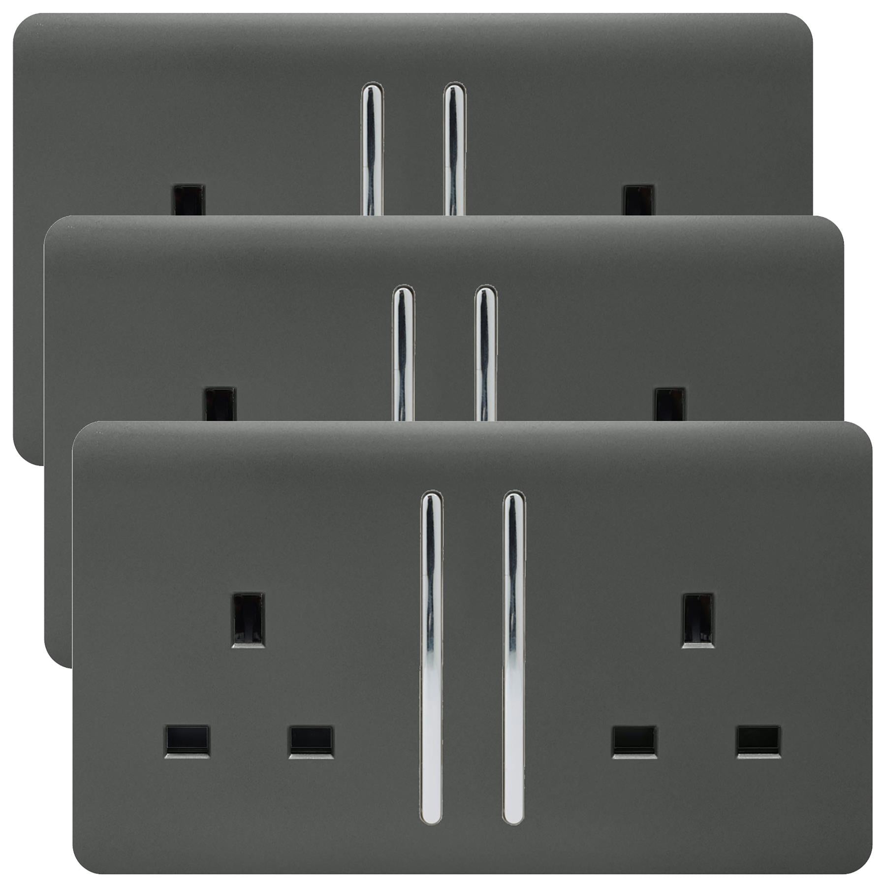 Trendi 2 Gang Artistic Modern Glossy 13 Amp Switched Tactile Plug Socket Charcoal (3 Pack)