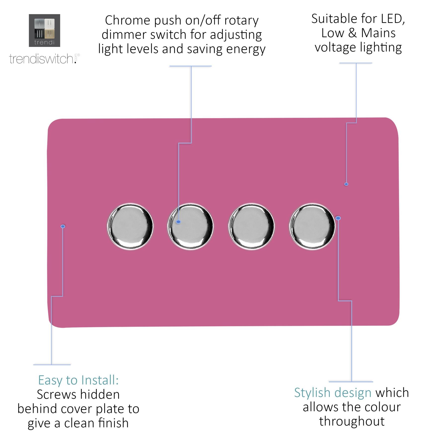 Upgrade your lighting with the Trendi Switch 4 Gang 2-Way 100w LED Dimmer Light Switch, a sleek and stylish solution for modern interiors. Designed for dimmable LED bulbs, this rotary push on/off dimmer offers smooth, reliable control with a maximum load of 5-100w LEDs. Crafted with a screwless faceplate and a premium chrome dimmer knob, the Trendi LED dimmer switch is as functional as it is elegant - making it the perfect choice for contemporary homes. Key Features: Product Colour: Candy Pink 4-Gang 2-Way Push On/Off Rotary LED Dimmer (5-100w LED load capacity) Ideal for LED lighting - tested for 0 10 dimmable LED bulbs Chrome knob finish for a premium designer look Screwless faceplate with included back and front plates Ultra-slim profile: 146 x 89 x 48mm (Faceplate depth: 8mm) Lightweight and durable: 250g Easy installation fits a 25mm back box Operating voltage: 220 250V AC 5-Year Warranty British made, certified & tested to BS EN 60669-2-1 Safe for indoor, domestic lighting circuits Safety Information: For indoor use only Use only with dimmable LED light bulbs (not suitable for non-dimmable fluorescents, wire-wound or toroidal transformers, TRIAC dimmable loads, or electric motors) Do not overload the switch The Trendi Switch LED Dimmer combines modern design with advanced functionality, giving you a reliable and stylish lighting solution. Whether you're upgrading a single room or renovating your entire home, this designer chrome dimmer switch adds a touch of elegance to any space #definedbydesign.