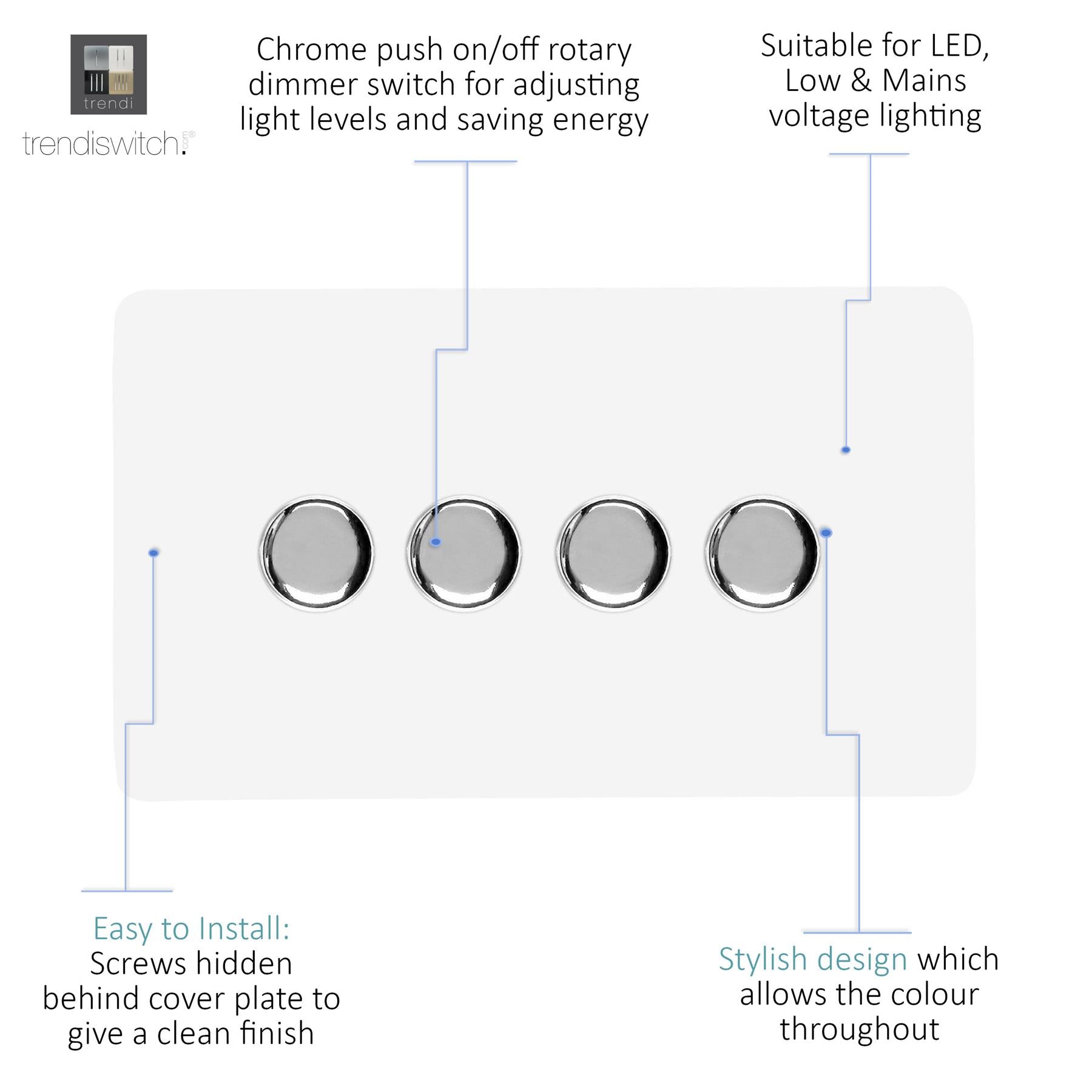 Upgrade your lighting with the Trendi Switch 4 Gang 2-Way 100w LED Dimmer Light Switch, a sleek and stylish solution for modern interiors. Designed for dimmable LED bulbs, this rotary push on/off dimmer offers smooth, reliable control with a maximum load of 5-100w LEDs. Crafted with a screwless faceplate and a premium chrome dimmer knob, the Trendi LED dimmer switch is as functional as it is elegant - making it the perfect choice for contemporary homes. Key Features: Product Colour: Ice White 4-Gang 2-Way Push On/Off Rotary LED Dimmer (5-100w LED load capacity) Ideal for LED lighting - tested for 0 10 dimmable LED bulbs Chrome knob finish for a premium designer look Screwless faceplate with included back and front plates Ultra-slim profile: 146 x 89 x 48mm (Faceplate depth: 8mm) Lightweight and durable: 250g Easy installation fits a 25mm back box Operating voltage: 220 250V AC 5-Year Warranty British made, certified & tested to BS EN 60669-2-1 Safe for indoor, domestic lighting circuits Safety Information: For indoor use only Use only with dimmable LED light bulbs (not suitable for non-dimmable fluorescents, wire-wound or toroidal transformers, TRIAC dimmable loads, or electric motors) Do not overload the switch The Trendi Switch LED Dimmer combines modern design with advanced functionality, giving you a reliable and stylish lighting solution. Whether you're upgrading a single room or renovating your entire home, this designer chrome dimmer switch adds a touch of elegance to any space #definedbydesign.