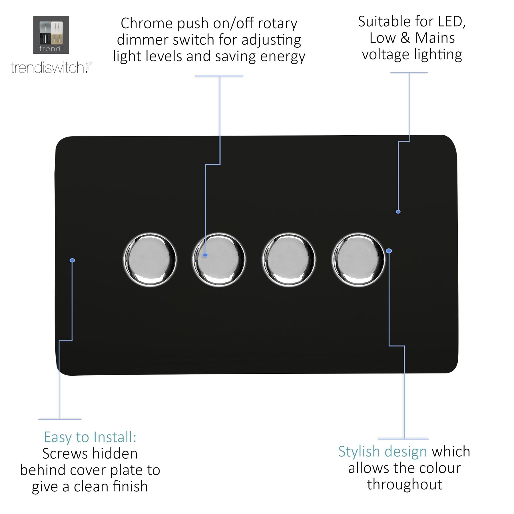 Upgrade your lighting with the Trendi Switch 4 Gang 2-Way 100w LED Dimmer Light Switch, a sleek and stylish solution for modern interiors. Designed for dimmable LED bulbs, this rotary push on/off dimmer offers smooth, reliable control with a maximum load of 5-100w LEDs. Crafted with a screwless faceplate and a premium chrome dimmer knob, the Trendi LED dimmer switch is as functional as it is elegant - making it the perfect choice for contemporary homes. Key Features: Product Colour: Matt Black 4-Gang 2-Way Push On/Off Rotary LED Dimmer (5-100w LED load capacity) Ideal for LED lighting - tested for 0 10 dimmable LED bulbs Chrome knob finish for a premium designer look Screwless faceplate with included back and front plates Ultra-slim profile: 146 x 89 x 48mm (Faceplate depth: 8mm) Lightweight and durable: 250g Easy installation fits a 25mm back box Operating voltage: 220 250V AC 5-Year Warranty British made, certified & tested to BS EN 60669-2-1 Safe for indoor, domestic lighting circuits Safety Information: For indoor use only Use only with dimmable LED light bulbs (not suitable for non-dimmable fluorescents, wire-wound or toroidal transformers, TRIAC dimmable loads, or electric motors) Do not overload the switch The Trendi Switch LED Dimmer combines modern design with advanced functionality, giving you a reliable and stylish lighting solution. Whether you're upgrading a single room or renovating your entire home, this designer chrome dimmer switch adds a touch of elegance to any space #definedbydesign.