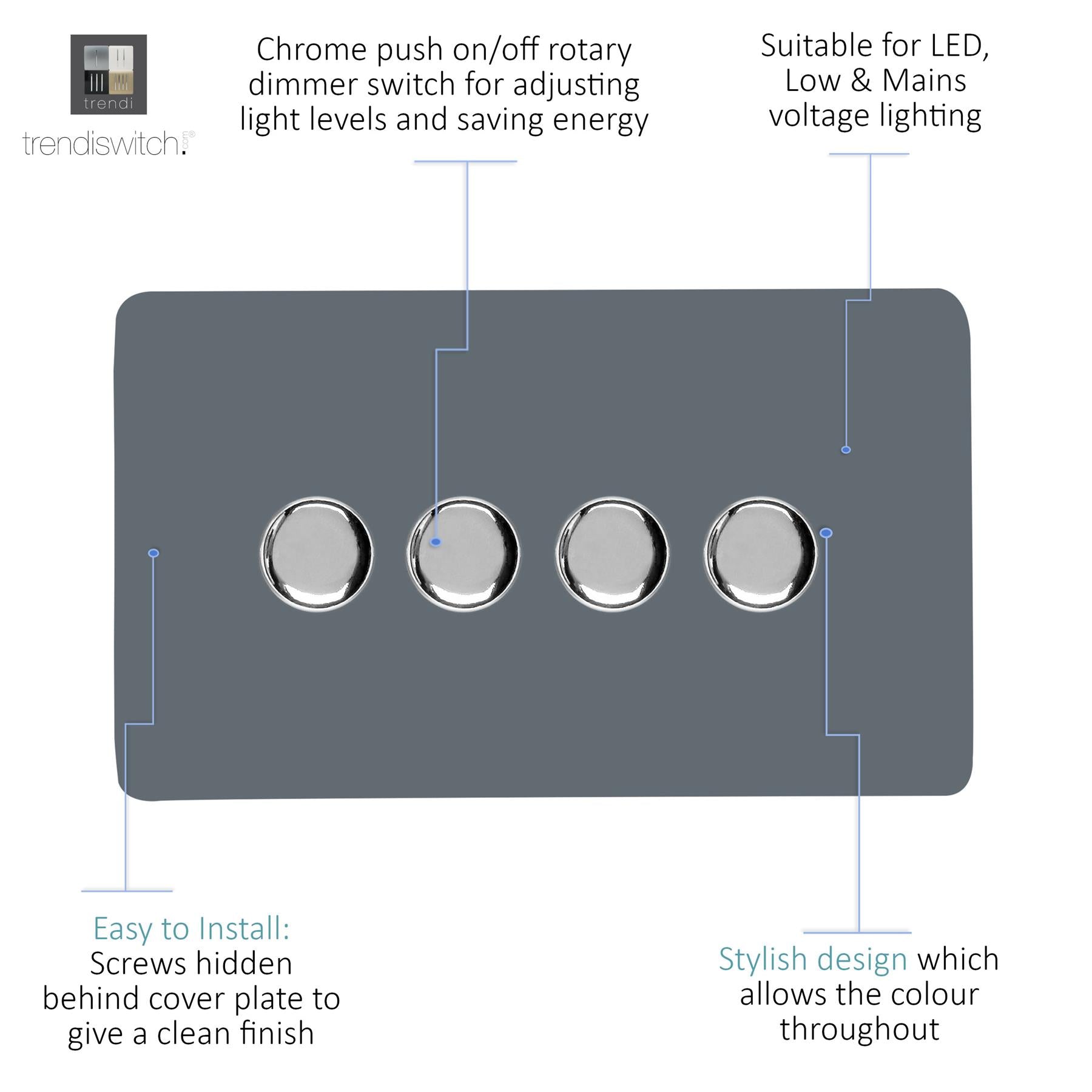 Upgrade your lighting with the Trendi Switch 4 Gang 2-Way 100w LED Dimmer Light Switch, a sleek and stylish solution for modern interiors. Designed for dimmable LED bulbs, this rotary push on/off dimmer offers smooth, reliable control with a maximum load of 5-100w LEDs. Crafted with a screwless faceplate and a premium chrome dimmer knob, the Trendi LED dimmer switch is as functional as it is elegant - making it the perfect choice for contemporary homes. Key Features: Product Colour: Warm Grey 4-Gang 2-Way Push On/Off Rotary LED Dimmer (5-100w LED load capacity) Ideal for LED lighting - tested for 0 10 dimmable LED bulbs Chrome knob finish for a premium designer look Screwless faceplate with included back and front plates Ultra-slim profile: 146 x 89 x 48mm (Faceplate depth: 8mm) Lightweight and durable: 250g Easy installation fits a 25mm back box Operating voltage: 220 250V AC 5-Year Warranty British made, certified & tested to BS EN 60669-2-1 Safe for indoor, domestic lighting circuits Safety Information: For indoor use only Use only with dimmable LED light bulbs (not suitable for non-dimmable fluorescents, wire-wound or toroidal transformers, TRIAC dimmable loads, or electric motors) Do not overload the switch The Trendi Switch LED Dimmer combines modern design with advanced functionality, giving you a reliable and stylish lighting solution. Whether you're upgrading a single room or renovating your entire home, this designer chrome dimmer switch adds a touch of elegance to any space #definedbydesign.