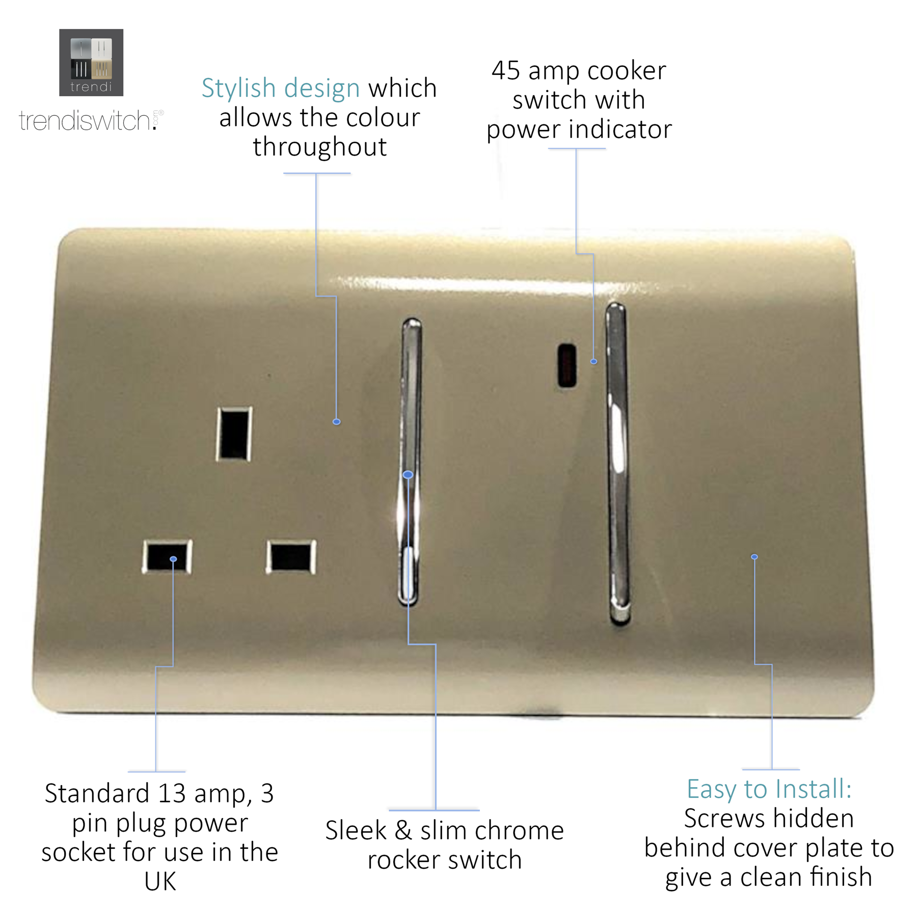 Trendi Artistic Modern 45 A Cooker Switch Inc Plug Socket & Neon Insert Gold