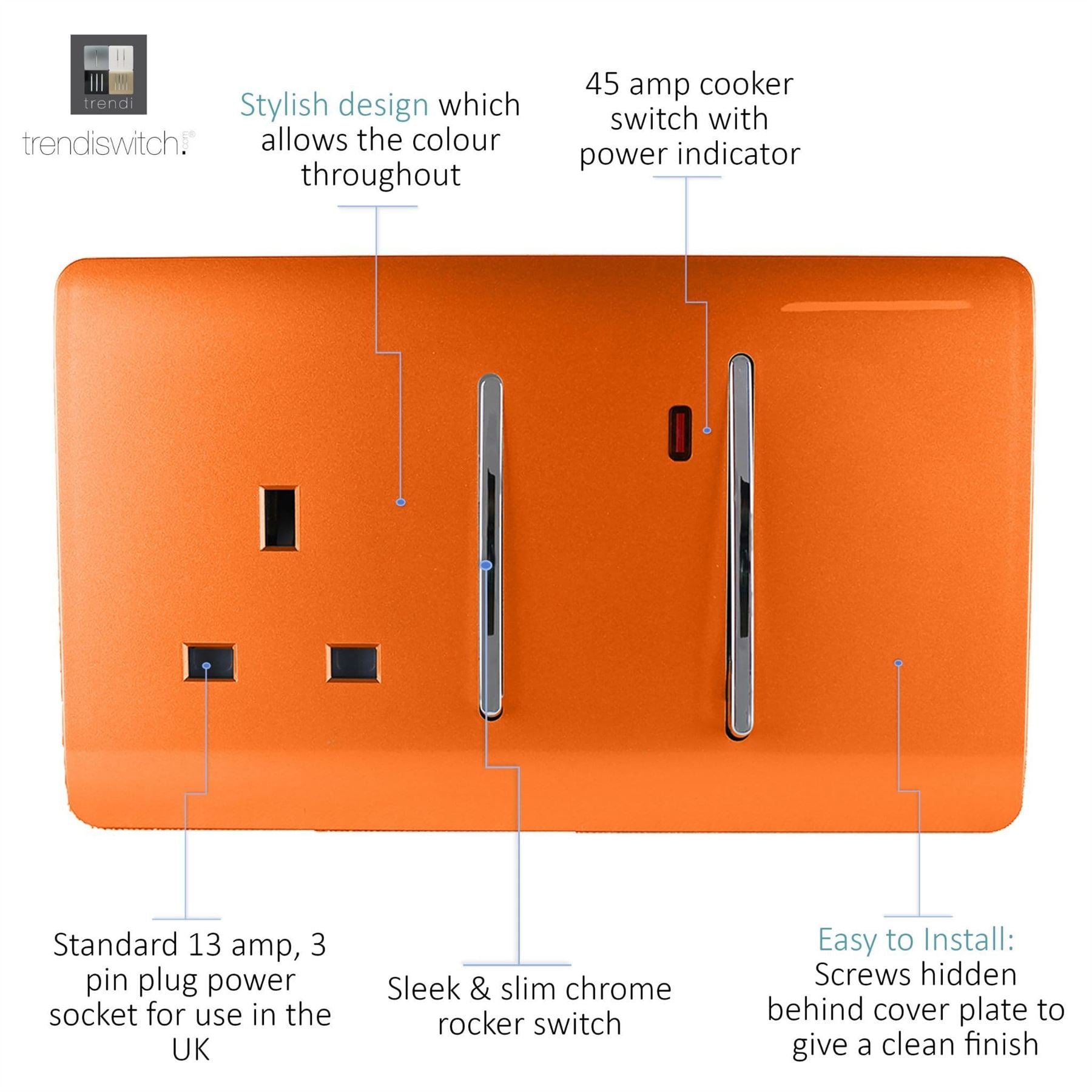 Trendi Artistic Modern Glossy 45 A Cooker Switch & Plug Socket Inc Neon Insert Orange