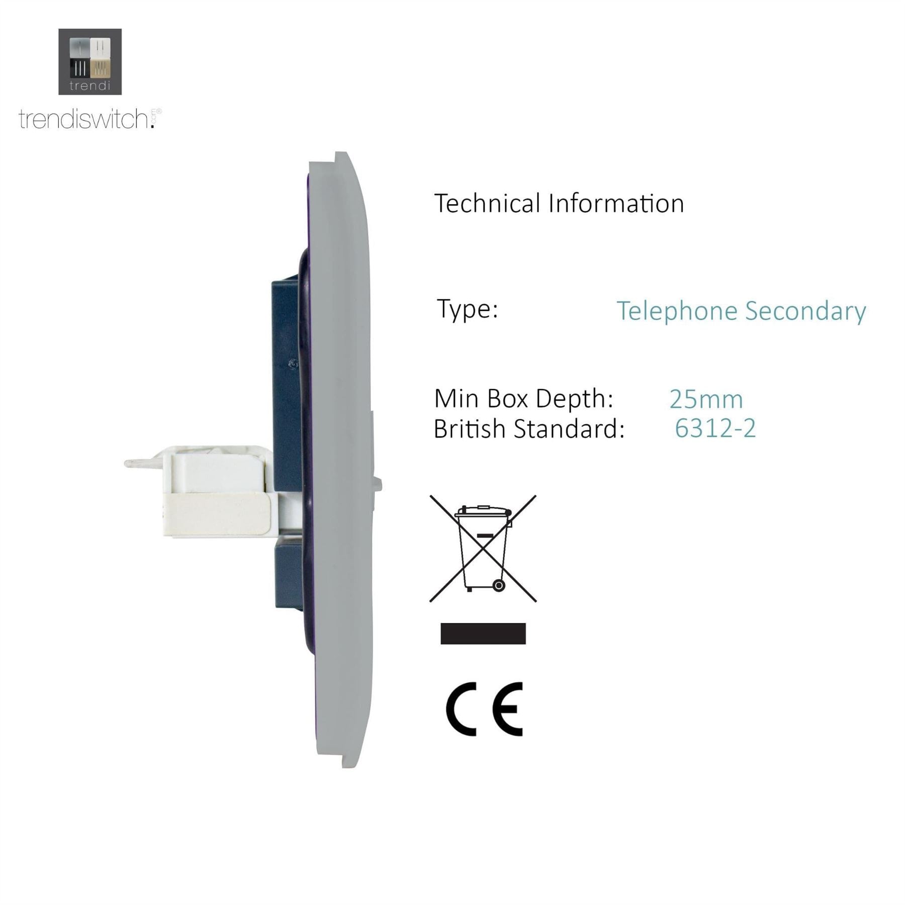 Product Description: 2 gang Telephone BOXED WEIGHT: 85g MEASUREMENTS: 88 x 88mm INSTALLATION DEPTH: 16mm PRODUCT WEIGHT: 65g FIXING CENTRES: 60.3mm FACEPLATE DEPTHS: 12m RECOMMENDED BACK BOX: 35mm or above OPERATING VOLTAGE: N/A MAXIMUM LOAD RATING: N/A MAXIMUM CURRENT RATING: N/A TERMINAL (LIVE) DIAMETRE: N/A CAPACITY: N/A TERMINAL(EARTH) DIAMETRES: N/A INTENDED APPLICATION: Indoor Use Only. Data circuits. SAFETY: Product does NOT require an earth APPLICABLE SAFETY STANDARD: BS EN 60669 PRODUCT FEATURES: Screwless faceplate - Back and Front Plates included Chrome light switch - #definedbydesign