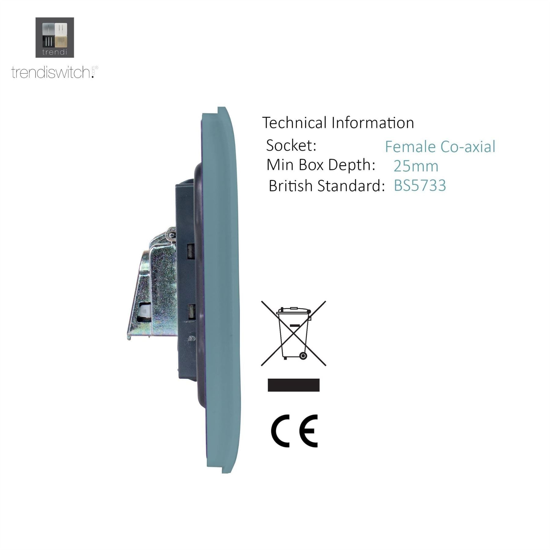 Product Description: 2 gang TV BOXED WEIGHT: 95g MEASUREMENTS: 88 x 88mm INSTALLATION DEPTH: 16mm PRODUCT WEIGHT: 75g FIXING CENTRES: 60.3mm FACEPLATE DEPTHS: 12m RECOMMENDED BACK BOX: 25mm or above OPERATING VOLTAGE: N/A MAXIMUM LOAD RATING: N/A MAXIMUM CURRENT RATING: N/A TERMINAL (LIVE) DIAMETRE: N/A CAPACITY: N/A TERMINAL(EARTH) DIAMETRES: N/A INTENDED APPLICATION: Indoor Use Only. Data circuits. SAFETY: Product does NOT require an earth APPLICABLE SAFETY STANDARD: BS EN 60669 PRODUCT FEATURES: TV socket for use with male co-axial plugs Screwless faceplate - Back and Front Plates included Chrome light switch - #definedbydesign