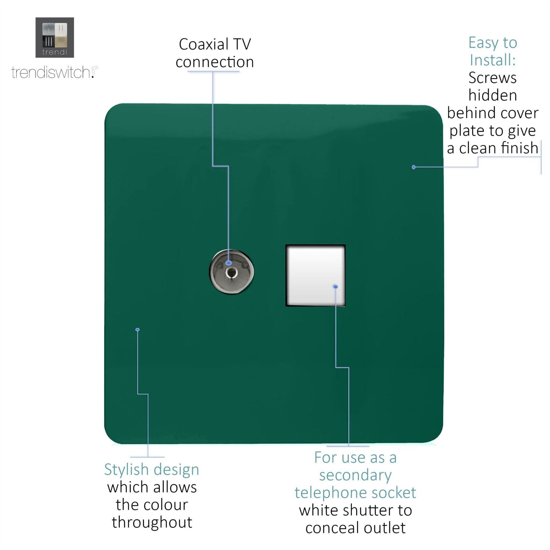 Trendi Artistic Modern Glossy Tactile TV Co-axial Socket + Telephone Socket Dark Green