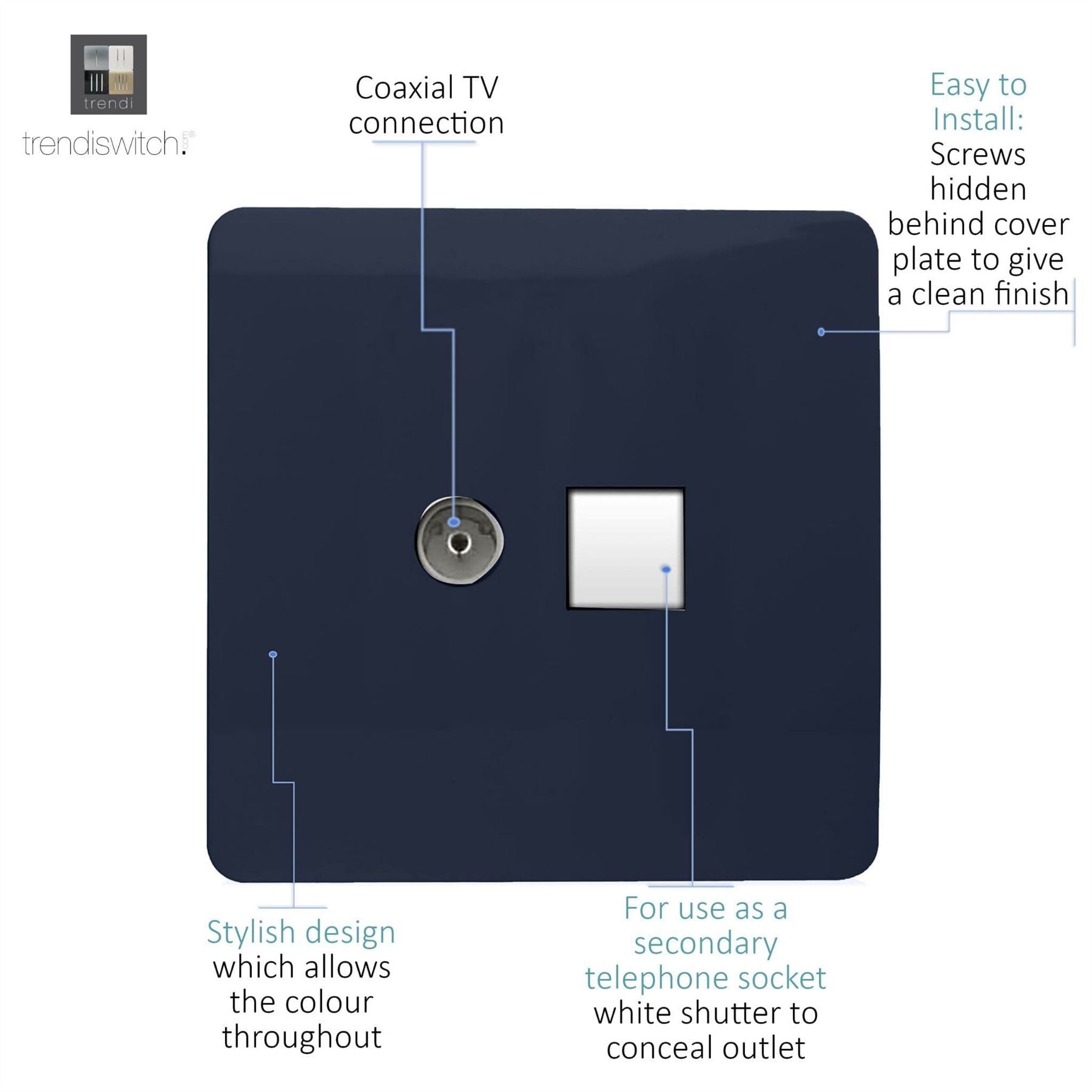 Trendi Artistic Modern Glossy Tactile TV Co-axial Socket + Telephone Socket Navy
