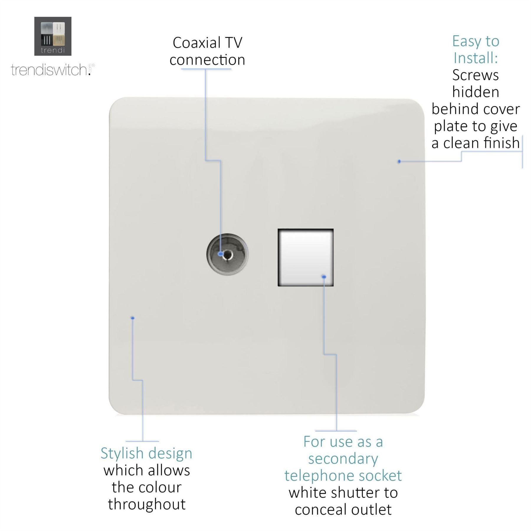 Trendi Artistic Modern TV Co-axial Socket + Telephone Socket White ART-TLP+TVWH