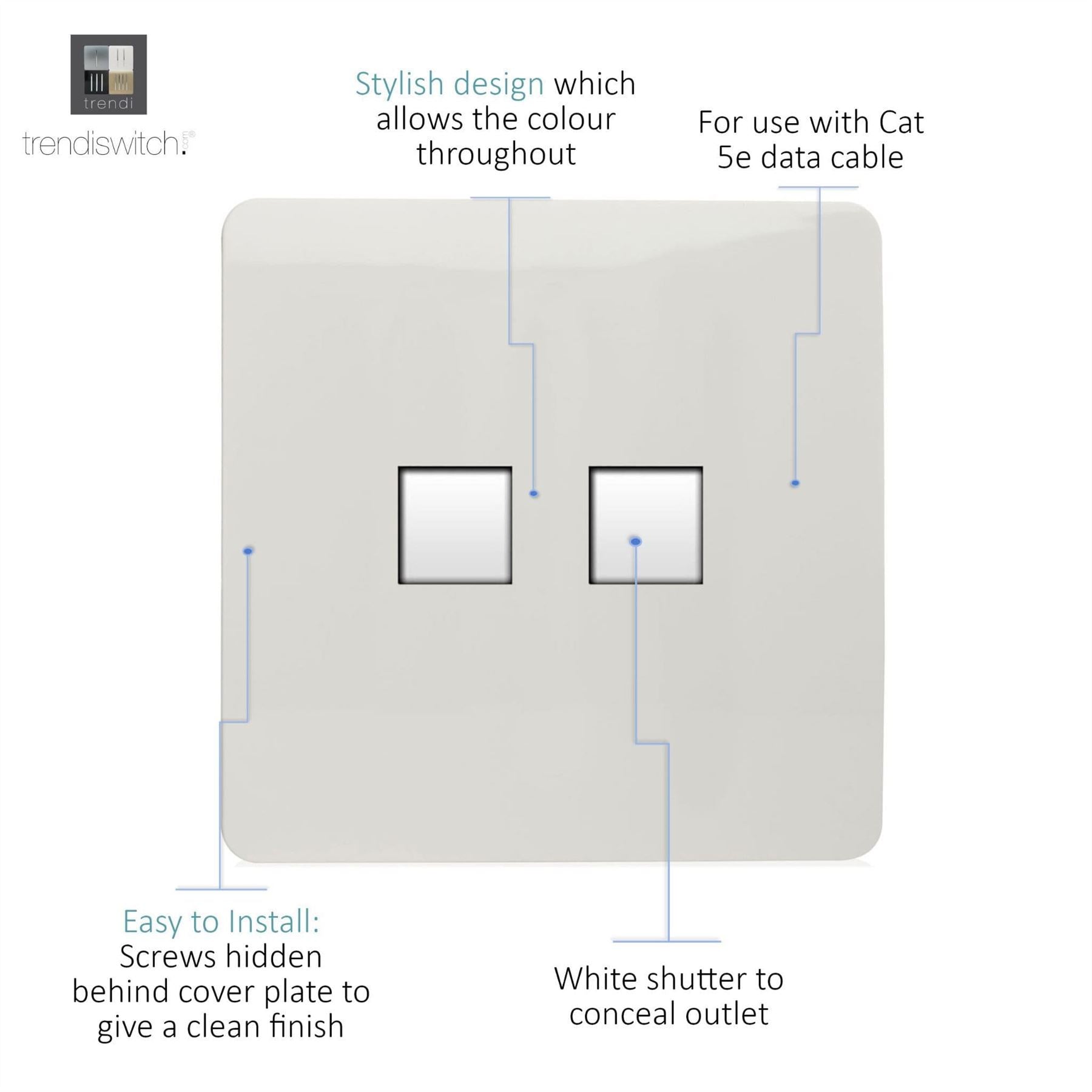 Trendi Modern 2 Gang RJ45 Cat 5e & Cat 6 PC Ethernet Socket White ART-2PCWH