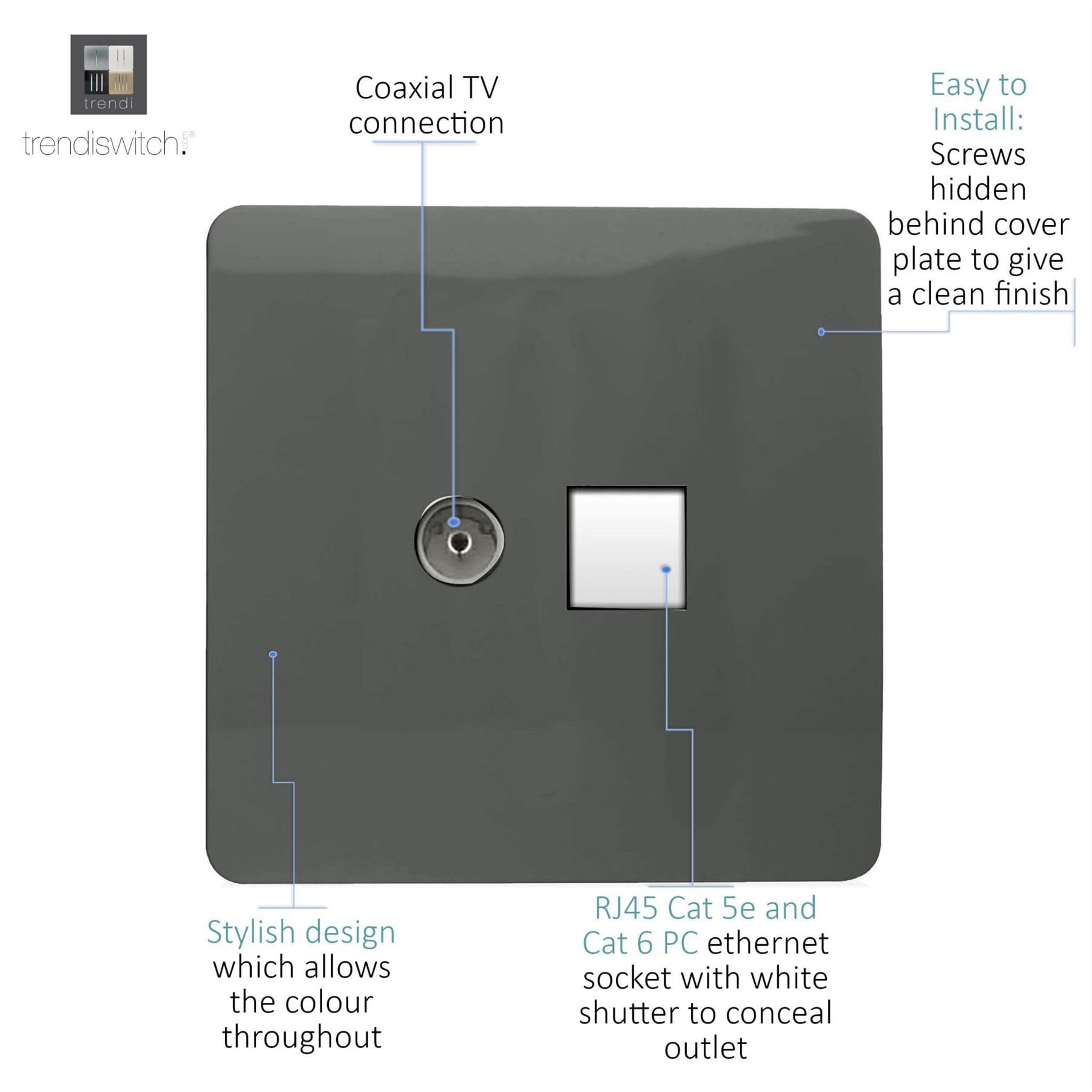 Trendi Modern Glossy Tactile TV Co-axial Socket+RJ45 Cat 5e&Cat 6 PC Ethernet Socket Charcoal