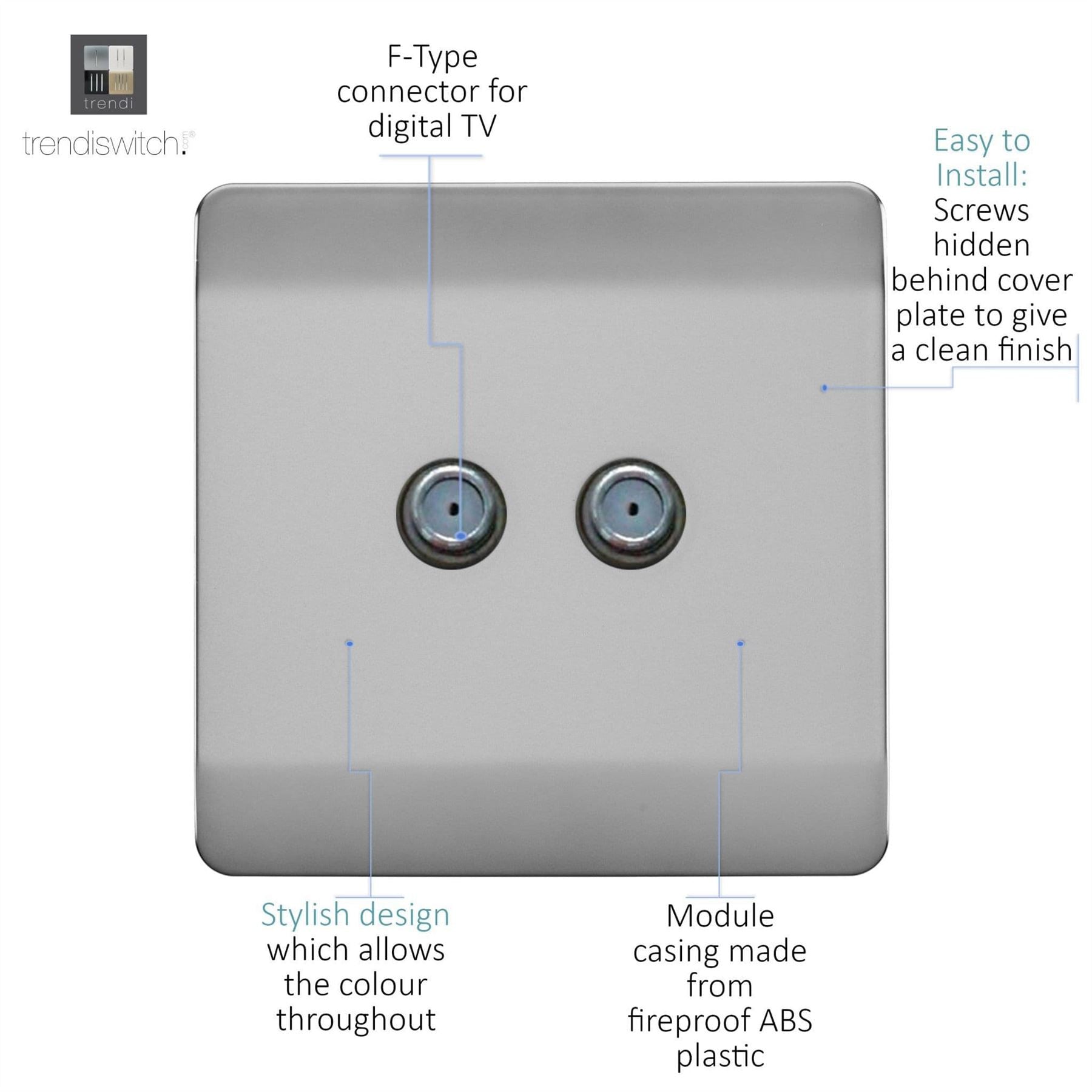 The Trendi Switch range of 2 gang male f-type satellite television sockets comprise of a "screwless" plate displaying the complete colour of the products. This is supported by a back frame that houses the screw holes & module for the product to be installed into compatible back boxes and wiring.
